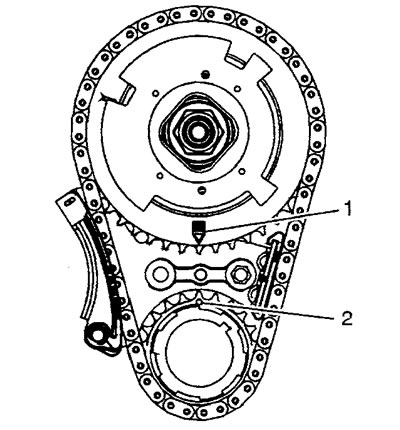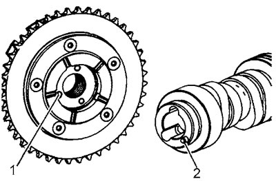 2. Определите относительное положение установочного отверстия (1) на звездочке привода распределительного вала и установочного штифта (2).
