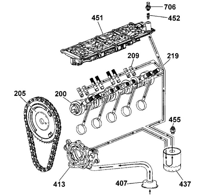 Двигатели LC9/LY5/LMG. 200 - распределительный вал, 205 - звездочка распределительного вала, 209 - толкатель (обычный), 219 - толкатель (системы отключения цилиндров), 407 - маслоприемник, 413 - масляный насос, 437 - масляный фильтр, 451 - масляный коллектор, 452 - масляный фильтр коллектора, 455 - редукционный клапан, 706 - датчик давления масла