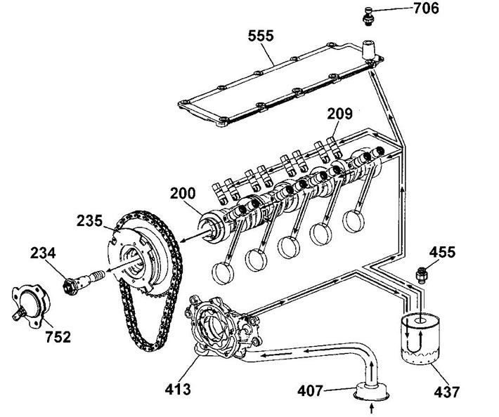 Двигатели LY6/L92 (без системы отключения цилиндров). 200 - распределительный вал, 209 - толкатель, 234 - электромагнитный клапан системы изменения фаз газораспределения, 235 - привод изменения фаз, 407 - маслоприемник, 413 - масляный насос, 437 - масляный фильтр, 455 - редукционный клапан, 555 - крышка развала, 706 - датчик давления масла, 752 - магнит привода изменения фаз газораспределения