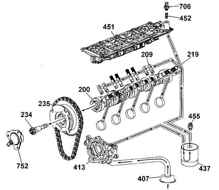 Двигатели L76/L92 (с системой отключения цилиндров). 200 - распределительный вал, 209 - толкатель (обычный), 219 - толкатель (системы отключения цилиндров), 234 - электромагнитный клапан системы изменения фаз газораспределения, 235 - привод изменения фаз, 407 - маслоприемник, 413 - масляный насос, 437 - масляный фильтр, 451 - масляный коллектор, 452 - масляный фильтр коллектора, 455 - редукционный клапан, 706 - датчик давления масла, 752 - магнит привода изменения фаз газораспределения