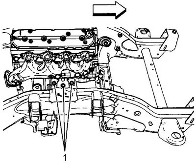 8. Через проем арки правого колеса отверните болты (1) крепления правой опоры к двигателю. Момент затяжки 50 Нм.