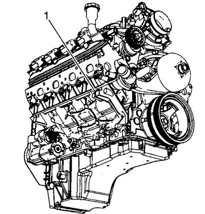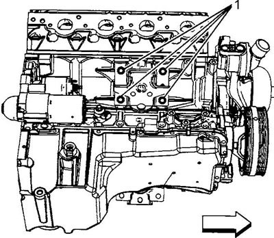 7. Подведите винтовой домкрат под технологический прилив (1) блока двигателя.