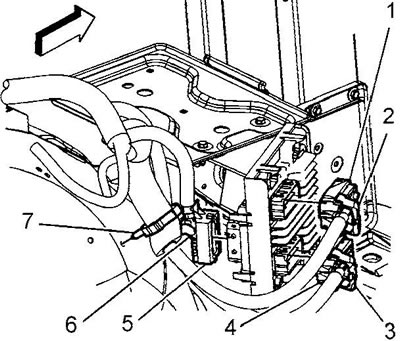 4. Отсоедините фиксатор (3) нижнего пучка проводов и разъедините разъем (4) блока управления.