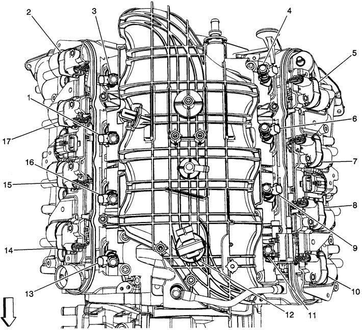Двигатель. Вид сверху, поздние модели. 1 - топливная форсунка №6, 2 - катушка зажигания №8, 3 - топливная форсунка №8, 4 - топливная форсунка №7, 5 - катушка зажигания №7, 6 - топливная форсунка №5, 7 - катушка зажигания №5, 8 - катушка зажигания №3, 9 - топливная форсунка №3, 10 - катушка зажигания №1, 11 - топливная форсунка №1, 12 - датчик абсолютного давления воздуха во впускном коллекторе, 13 - топливная форсунка №4, 14 - катушка зажигания №4, 15 - катушка зажигания №2, 16 - топливная форсунка №2, 17 - катушка зажигания №6