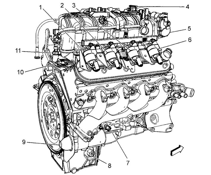 Правая сторона двигателя, поздние модели. 1 - катушка зажигания №8, 2 - катушка зажигания №6, 3 - катушка зажигания №4, 4 - датчик абсолютного давления воздуха во впускном коллекторе, 5 - корпус дроссельной заслонки, 6 - катушка зажигания №2, 7 - датчик детонации №2, 8 - датчик уровня масла, 9 - стартер, 10 - масляный коллектор системы отключения цилиндров (если установлен), 11 - датчик давления моторного масла