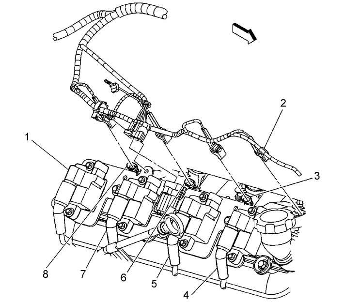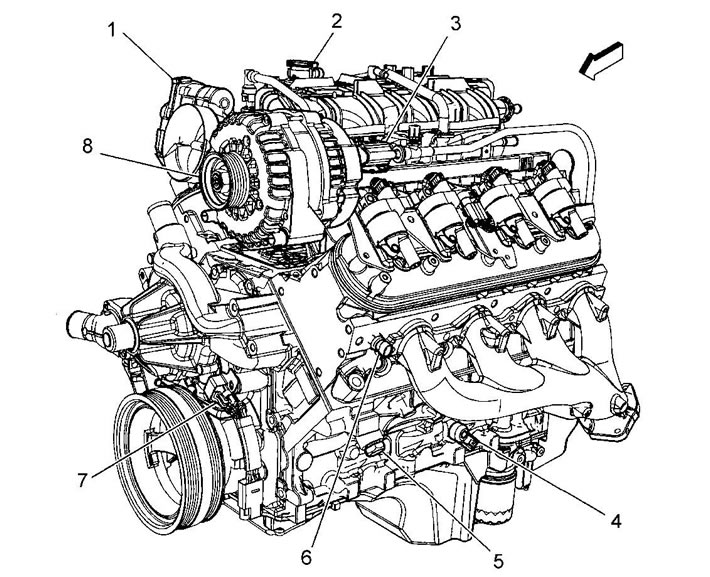 Правая сторона двигателя (ранние модели). 1 - катушка зажигания №8, 2 - жгут проводов форсунок, 3 - форсунка №4, 4 - катушка зажигания №2, 5 - катушка зажигания №4, 6 - форсунка №6, 7 - катушка зажигания №6, 8 - форсунка №8