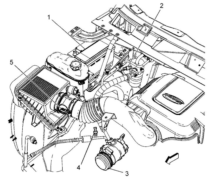 Правая задняя часть моторного отсека (поздние модели). 1 - аккумуляторная батарея, 2 - датчик низкого давления в системе кондиционирования, 3 - муфта компрессора кондиционера, 4 - выключатель по давлению в системе кондиционирования, 5 - датчик массового расхода воздуха / датчик температуры воздуха
