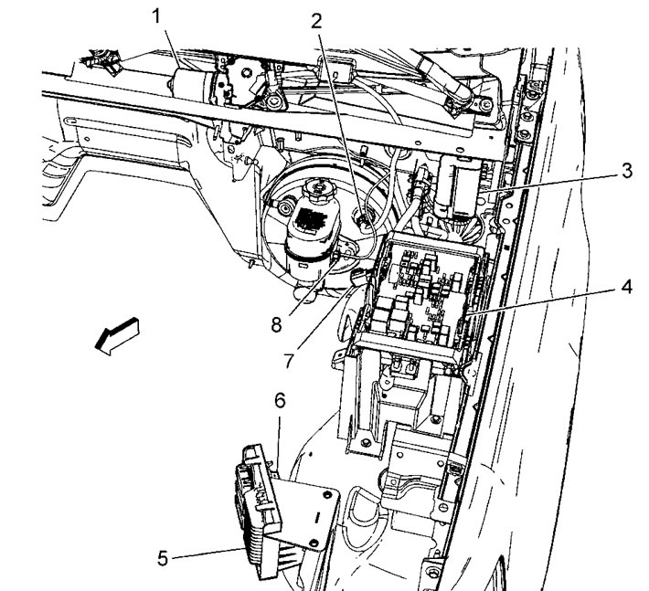 Левая сторона моторного отсека, (поздние модели). 1 - двигатель стеклоочистителя ветрового стекла, 2 - вакуумный усилитель тормозов, 3 - подогреватель жидкости омывателя ветрового стекла (ХА7), 4 - блок предохранителей, 5 - блок управления двигателем, 6 - блок управления АКПП, 7 - датчик разрежения усилителя тормозов, 8 - датчик уровня тормозной жидкости