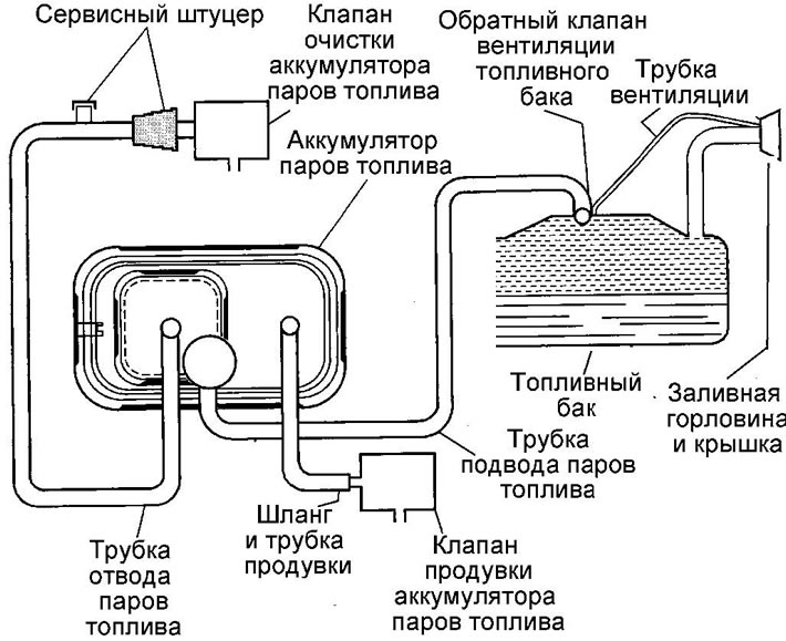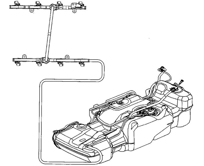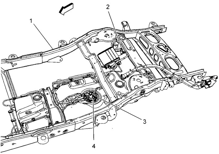 Детали топливной системы на шасси (поздние модели, короткая база). 1 - рама, 2 - клапан продувки аккумулятора паров топлива, 3 - датчик давления в топливном баке, 4 - топливный насос и датчик уровня топлива