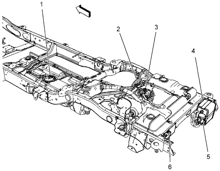 Детали топливной системы на шасси (поздние модели, длинная база). 1 - топливный насос и датчик уровня топлива (первичный), 2 - датчик давления в топливном баке, 3 - топливный насос и датчик уровня топлива (вторичный, кроме NQZ), 4 - аккумулятор паров топлива, 5 - клапан продувки аккумулятора паров топлива, 6 - электронный блок управления подвеской