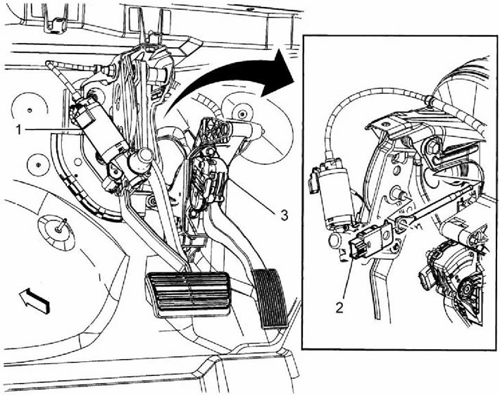 Сборка педалей (поздние модели, JF4). 1 - электронная педаль (JF4), 2 - выключатель стоп-сигналов, 3 - датчик положения педали акселератора