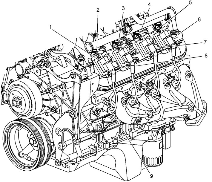 Левая сторона двигателя, (ранние модели). 1 - катушка зажигания №1, 2 - форсунка №1, 3 - форсунка №3, 4 - форсунка №5, 5 - форсунка №7, 6 - катушка зажигания №7, 7 - катушка зажигания №5, 8 - катушка зажигания №3, 9 - датчик температуры охлаждающей жидкости