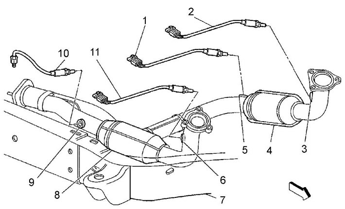 Кислородные датчики. Двигатель 5,3 л (ранние модели). 1 - кислородный датчик (B1S2), 2 - кислородный датчик (B1S1), 3 - место установки кислородного датчика (B1S1), 4 - каталитический нейтрализатор ОГ (В1), 5 - место установки кислородного датчика (B1S2), 6 - место установки кислородного датчика (B2S1), 7 - рама (правая сторона), 8 - каталитический нейтрализатор ОГ (В2), 9 - место установки кислородного датчика (B2S2), 10 - кислородный датчик (B2S2), 11 - кислородный датчик (B2S1)