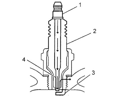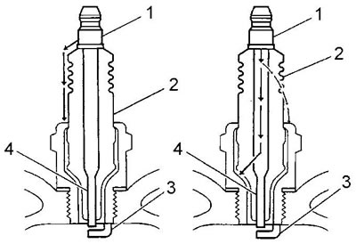 Осмотрите изолятор (2), ищите трещины или отложения сажи. Трещины или сажа приводит к пробою между клеммой (1) и "землей" вместо пробоя между электродами (3) и (4).