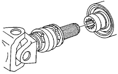 3. Если карданный вал имеет чехол компенсатора длины с одним хомутом, заведите карданный вал в шлицы выходного вала раздаточной коробки.