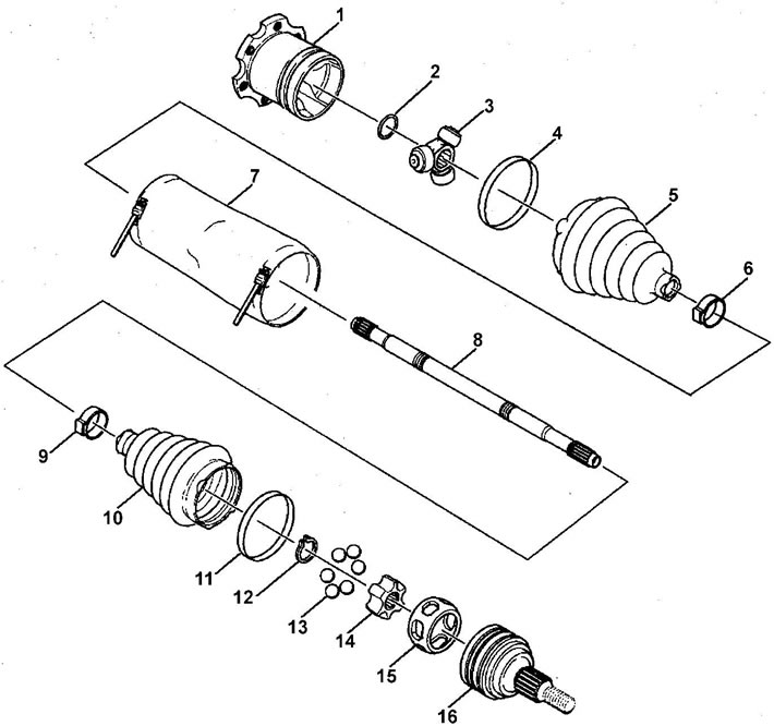 Разборка и сборка приводных валов. 1 - корпус внутреннего ШРУС'а, 2 - стопорное кольцо, 3 - крестовина внутреннего ШРУС'а, 4 - штампованное кольцо, 5 - чехол скользящего ШРУС'а, 6 - малый хомут чехла, 7 - защита чехла (опция), 8 - стержень вала, 9 - малый хомут чехла, 10 - чехол ШРУС'а, 11 - штампованное кольцо, 12 - стопорное кольцо, 13 - шарик, 14 - внутренняя обойма, 15 - сепаратор, 16 - наружная обойма.