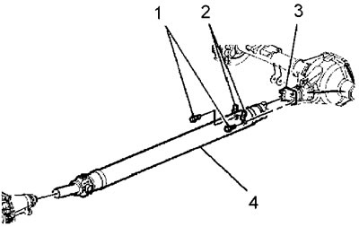 3. Нанесите метки относительного положения карданного вала (4) и выходного вала раздаточной коробки.