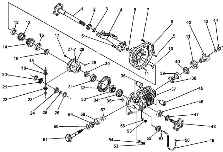 Редуктор 8,25 дюйма, не отключаемый мост, ранние модели. 1 - полуось, 2 - сальник полуоси, 3 - подшипник полуоси, 4 - балка моста, 5 - стопорное кольцо полуоси, 6 - болт крепления балки моста, 7 - болт крышки картера редуктора, 8 - крышка картера редуктора, 9 - направляющий штифт, 10 - фиксатор регулятора подшипника, 11 - направляющий штифт, 12 - подшипник вала сцепления, 13 - гайка регулировки подшипника, 14 - втулка гайки регулировки подшипника, 15 - кольцо бокового подшипника дифференциала, 16 - боковой подшипник дифференциала, 17 - болт крепления ведомой шестерни редуктора, 18 - упорная шайба ведущей шестерни дифференциала, 19 - ведущая шестерня дифференциала, 20 - упорная шайба боковой шестерни, 21 - боковой подшипник дифференциала, 22 - ведущая шестерня дифференциала, 23 - упорная шайба ведущей шестерни, 24 - боковая шестерня дифференциала, 25 - фиксатор боковой шестерни. 26 - упорная шайба боковой шестерни, 27 - вал ведущих шестерен дифференциала, 28 - чашка дифференциала, 29 - болт фиксации вала ведущих шестерен, 30 - боковой подшипник дифференциала, 31 - кольцо бокового подшипника, 32 - ведомая шестерня редуктора, 33 - гайка регулировки подшипника, 34 - втулка гайки регулировки подшипника, 35 - фиксатор гайки регулировки подшипника, 36 - втулка картера редуктора, 37 - картер редуктора, 38 - внешний подшипник ведущей шестерни редуктора, 39 - кольцо внешнего подшипника редуктора, 40 - сальник, 41 - дефлектор, 42 - вилка карданного шарнира, 43 - шайба вилки, 44 - гайка крепления вилки, 45 - втулка картера редуктора, 46 - подшипник полуоси, 47 - сальник полуоси, 48 - полуось, 49 - шланг сапуна, 50 - сапун, 51 - хомут, 52 - штуцер шланга сапуна, 53 - сливная пробка картера редуктора, 54 - уплотнительная шайба, 55 - пробка уровня, 56 - уплотнительная шайба, 57 - проставка подшипника ведущей шестерни редуктора, 58 - кольцо подшипника ведущей шестерни редуктора, 59 - подшипник ведущей шестерни редуктора, 60 - регулировочная шайба, 61 - ведущая шестерня редуктора.