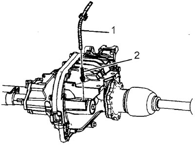 3. Отсоедините шланг сапуна (1) от штуцера (2) на картере редуктора.