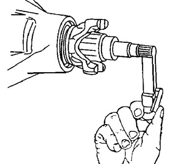 7. Затяните гайку крепления вилки так. чтобы был почти выбран осевой зазор вала шестерни. При этом вращайте вал шестерни для обеспечения правильной посадки подшипников.
