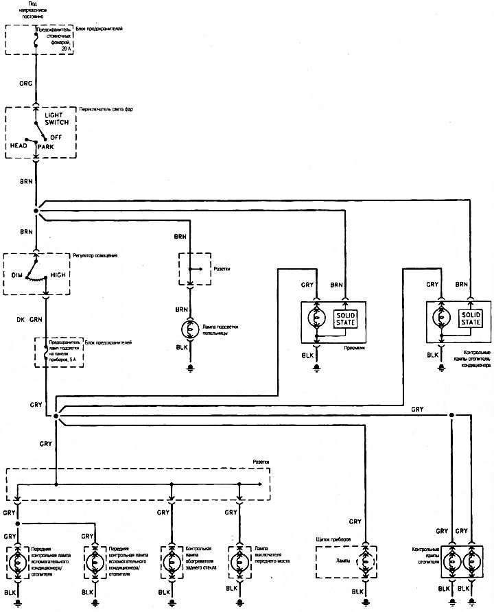 Електрическа схема за осветление на арматурното табло, превключватели, пепелник, часовник и аудио система
