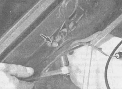9.3. Отверните болт (указан стрелкой), крепящий провод "массы" в моторном отсеке