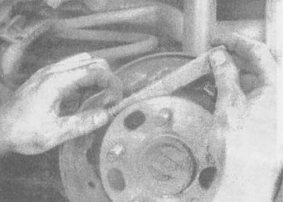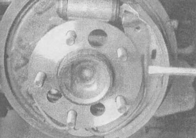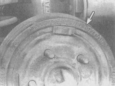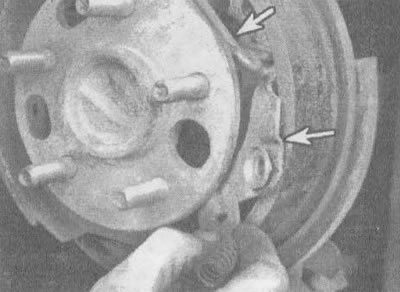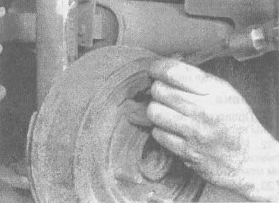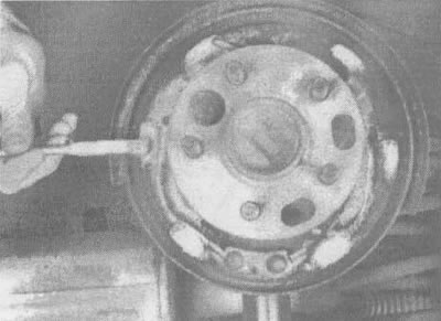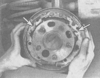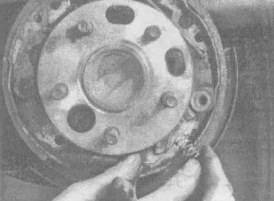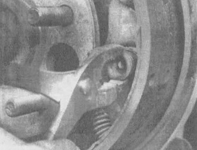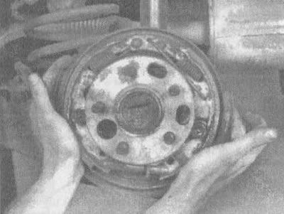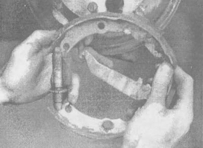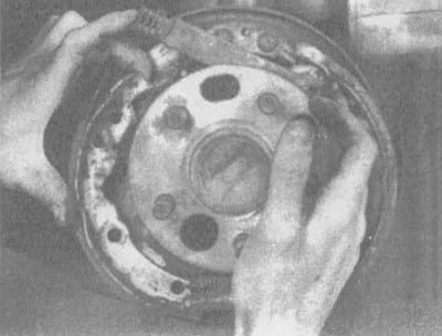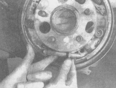 5.4ц. Растяните колодки так, чтобы через них прошел фланец ступицы, и вставьте колодки на место (автомобили выпуска 1990 и 1991 гг.) |