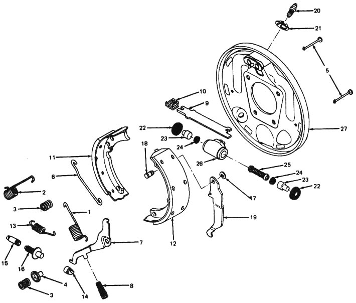 5.4в. Детали барабанной тормозной системы (автомобили выпуска 1990 и 1991 гг.): 1 - возвратная пружина, 2 - возвратная пружина, 3 - удерживающая пружина, 4 - ось рычага, 5 - удерживающий штифт, 6 - ограничитель, 7 - рычаг привода, 8 - возвратная пружина рычага, 9 - распорная планка, 10 - пружина планки, 11 - первичная колодка, 12 - вторичная колодка, 13 - пружина регулировочного винта, 14 - головка, 15 - втулка, 16 - регулировочный винт, 17 - стопорное кольцо, 18 - шпилька, 19 - рычаг стояночного тормоза, 20 - клапан прокачки, 21 - фиксатор цилиндра, 22 - защитный чехол, 23 - поршень, 24 - манжета, 25 - пружина, 26 - рабочий тормозной цилиндр, 27 - тормозной щит