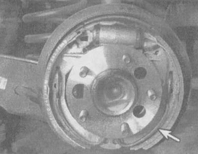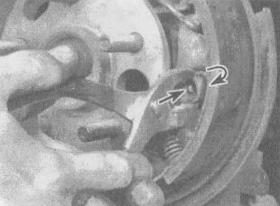 5.4п. На автомобилях выпуска с 1992 года, пользуясь отверткой, извлеките стяжную пружину (указана стрелкой). При установке новых колодок на этих автомобилях сначала выполните операции пунктов 5.4у и 5.4ф, затем в обратном порядке пункты снятия и приступайте к пункту 5.4г |