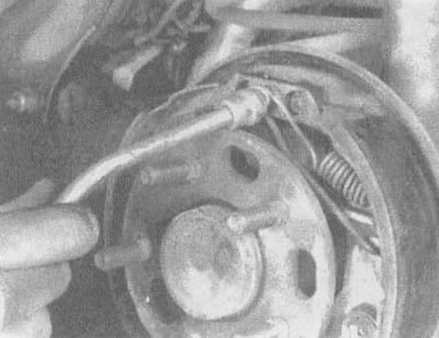 5.4м. На автомобилях 1992 года выпуска поднимите пружину с задней тормозной колодки и выверните колодку из области ступицы, чтобы получить доступ к тросу стояночного тормоза |
