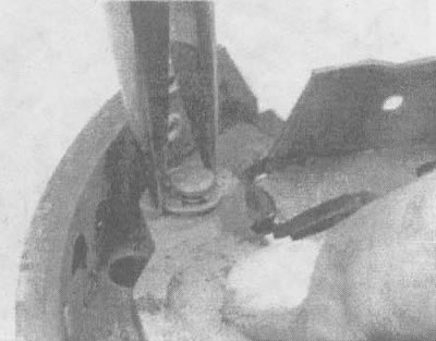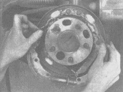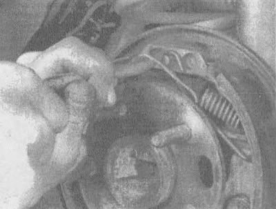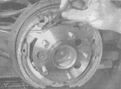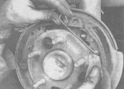 5.4д. Пользуясь специальным инструментом для извлечения тормозных пружин, снимите возвратные пружины (для автомобилей выпуска 1990 и 1991 гг.) |
