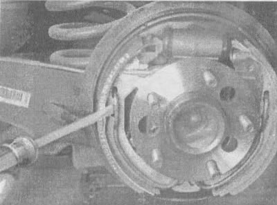 5.4з. Вставьте отвертку с плоским концом под пружину и выдавите пружину из первичной колодки, затем снимите колодку (автомобили выпуска 1992 года) |