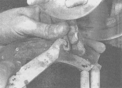 5.4ж. Снимите удерживающие (прижимные) пружины и шпильки, нажав плоскогубцами и повернув (указано стрелкой) (автомобили выпуска 1990 и 1991 гг.) |