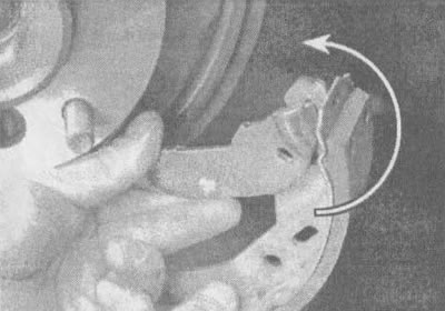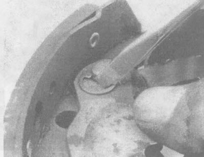 5.4о. На автомобилях 1992 года выпуска поверните тормозную колодку, чтобы освободить рычаг стояночного тормоза от колодки |