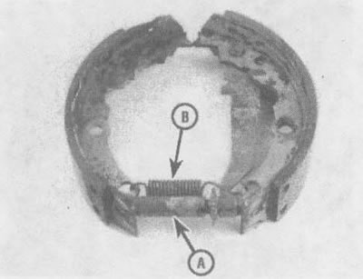 5.4р. Отверните регулировочный винт (А) и снимите пружину (В) с колодок, обратите внимание на положение, в котором они устанавливаются (автомобили выпуска 1990 и 1991 гг.) |