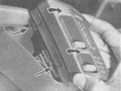 3. Осторожно поддев верхний наружный угол переключателя небольшой отверткой, отсоедините стопорные зажимы и, поворачивая, извлеките переключатель из приборной панели (см. иллюстрацию).