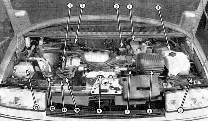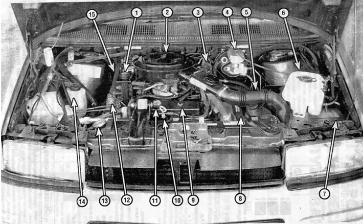 Моторный отсек автомобиля с двигателем 3,1 л: 1 - бачок насоса гидроусилителя рулевого управления (раздел 7), 2 - воздушный фильтр (раздел 19), 3 -распределитель (раздел 33), 4 - бачок тормозной жидкости (раздел 4), 5 - щуп для определения уровня масла в автоматической коробке передач (раздел 6), 6 - бачок омывателя (раздел 4), 7 - аккумуляторная батарея (раздел 8), 8 - шланг радиатора (раздел 10), 9 - клапан вентиляции картера (раздел 30), 10 - щуп для измерения уровня моторного масла (раздел 4), 11 - крышка маслозаливной горловины (раздел 4), 12 - табличка со схемой укладки поликлинового ремня (раздел 21), 13 - пробка радиатора (разделы 9 и 29), 14 - расширительный бачок (разделы 4 и 29), 15 - поликлиновой ремень (раздел 21)