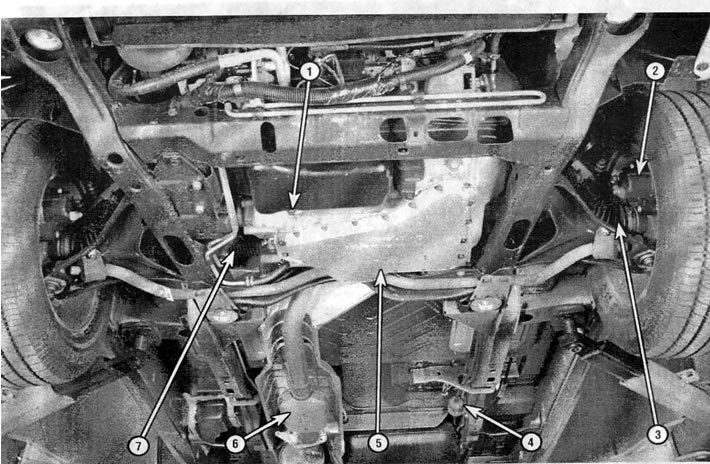 Вид снизу на двигатель и коробку передач: 1 - пробка сливного отверстия моторного масла (раздел 12), 2 - тормозной суппорт переднего диска (раздел 17), 3 - чехол шарнира полуоси (раздел 13), 4 - топливный фильтр (раздел 25), 5 - картер главной передачи в блоке с автоматической коробкой передач (раздел 27), 6 - выпускная система (раздел 15), 7 - чехол рулевого механизма (раздел 14)