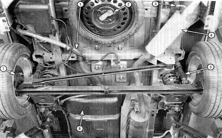 Вид задней части автомобиля снизу: 1 - шланг заливной горловины топливного бака (раздел 18), 2 - запасное колесо (раздел 24), 3 - крепление выпускной системы (раздел 15), 4 - глушитель (раздел 15), 5 - задний амортизатор (раздел 14), 6 - топливный бак (раздел 18), 7 - задний тормоз барабанного типа (раздел 17)