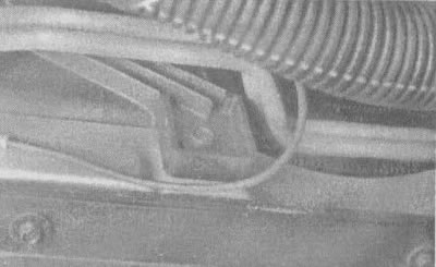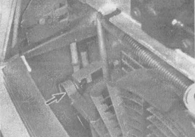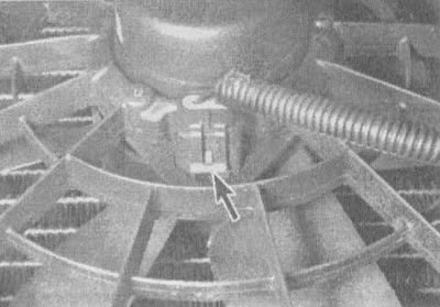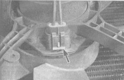 4.45а. Электрический разъем заднего вентилятора располагается под электродвигателем вентилятора (вид снизу). Отсоедините его, отжав усико разъема (указано стрелкой) |