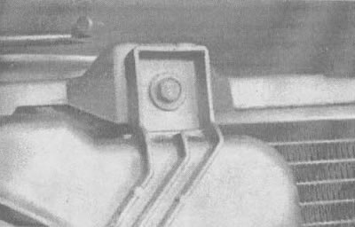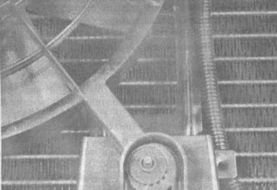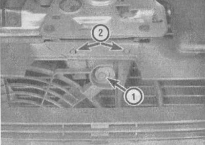 4.45в. ...и верхний болты крепления вентилятора; для облегчения доступа к среднему болту отверните болты крышки вентилятора, потяните крышку вперед и вытащите,... 1 - болт вентилятора, 2 - болты крышки вентилятора |