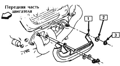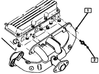 9.7. Детали крепления переднего выпускного коллектора: 1 - коллектор, 2 - болт