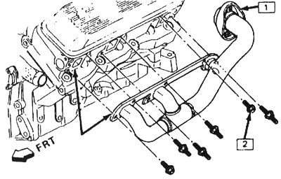 12. Отверните два болта, крепящие перепускную трубу к заднему выпускному коллектору.