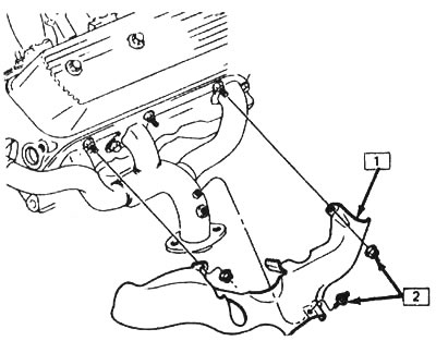 7. Отверните болты крепления выпускного коллектора и отсоедините коллектор от головки цилиндров (см. иллюстрацию).