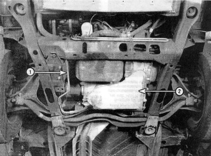 1.1. Вид снизу автоматической коробки передач и связанных с ней узлов: 1 - трубопровод системы охлаждения коробки передач, 2 - картер коробки передач