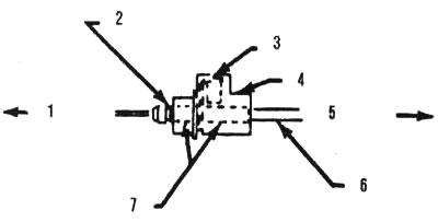 3.8. Детали регулировки троса дроссельной заслонки: 1 - рычаг дроссельной заслонки, 2 - ползун к патрубку (нулевое положение или состояние для корректировки положения), 3 - скоба, 4 - наконечник, 5 - направление корректировки (регулировки), 6 - трос, 7 - ползун