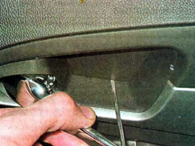 2. Тонкой шлицевой отверткой поддеваем декоративную заглушку внутренней ручки открывания двери...