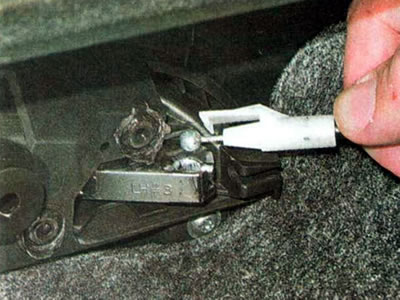 7. С внутренней стороны обивки двери отсоединяем колодки жгута проводов от блока управления электроприводом зеркал...
