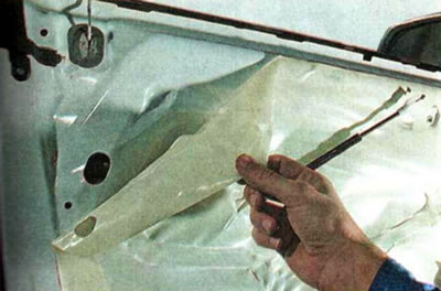 2. Снимаем обивку двери и аккуратно отклеиваем от двери защитную пленку.