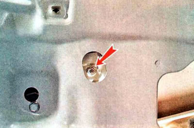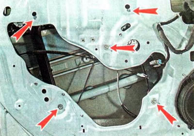 8. Ключом на 10 мм отворачиваем пять болтов крепления мотор-редуктора и направляющих стекла к двери.